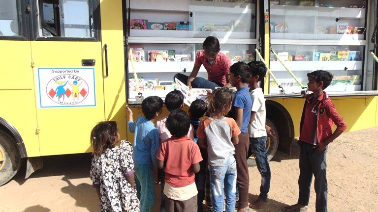 Set up since January 2019, the library bus runs through the streets of the most disadvantaged neighborhoods of Jaïpur "shantytowns" offering children the opportunity to escape through reading.