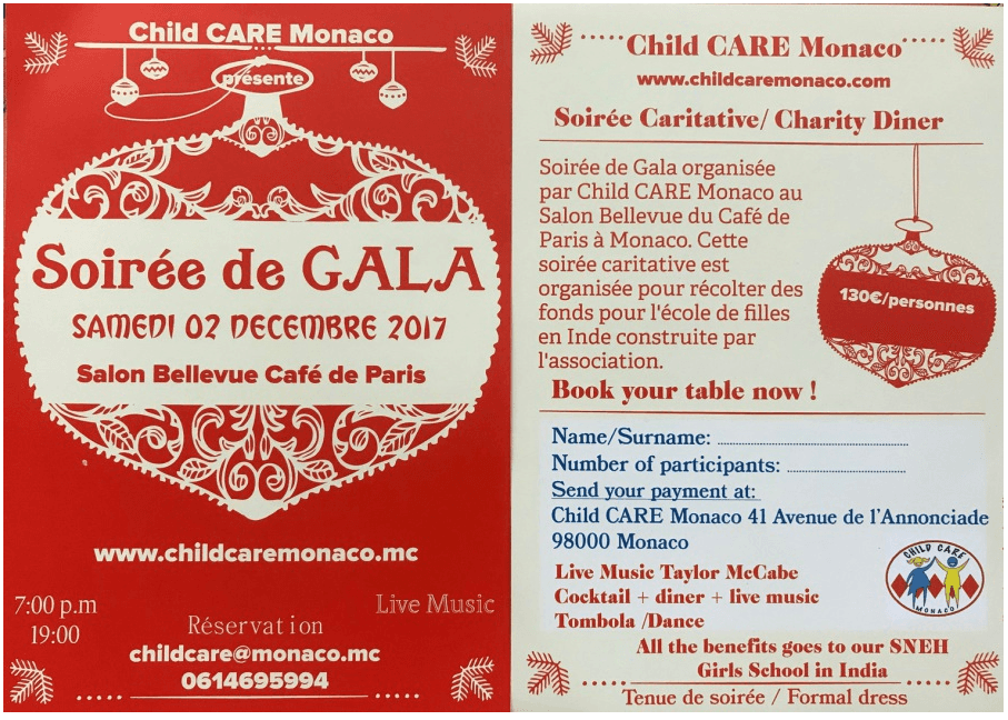 Child CARE Monaco is proud to invite you to our Xmas Gala Dinner at the SALON BELLEVUE, Place du Casino of Monte-Carlo (Café de Paris). Live music, dancing, Show.... Starting with an aperitif on the roof top with the amazing view on the Place du Casino and it's beautiful Xmas decoration. The benefits of this event will go to our girls school in India.